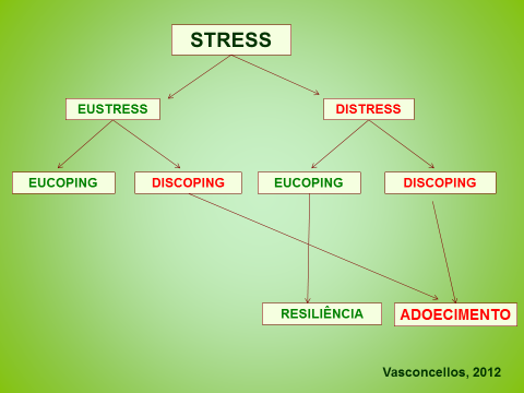 Os recursos de enfrentamento para os fatores stressores são conhecidos como coping. Este é o processo de recrutamento de registros do aparelho cognitivo (identificação, memória, associação) utilizados para criar uma reposta adequada e eficiente aos fatores stressores. Dele depende a constituição ou não do estado de distress. Se a resposta for eficiente teremos o eucoping, caso contrário, o discoping. A saúde física e psíquica do indivíduo depende dessa dinâmica conforme observado na Figura 1.